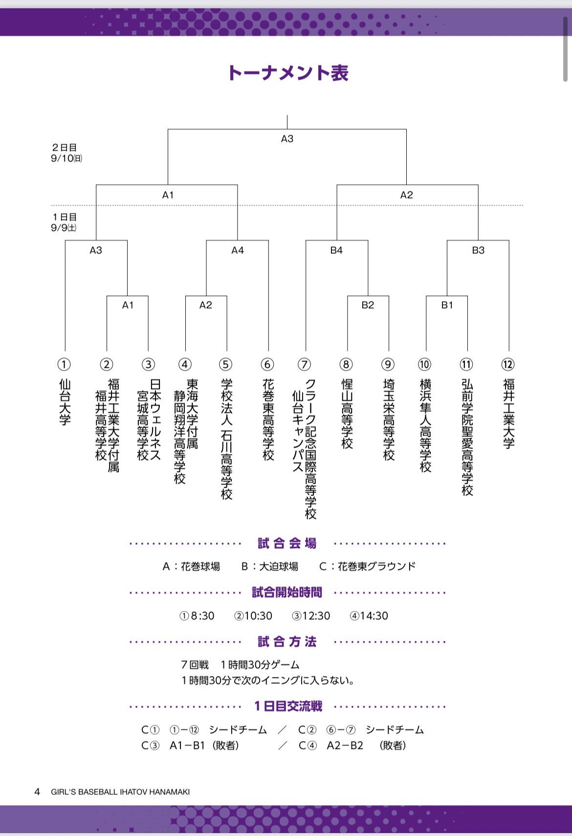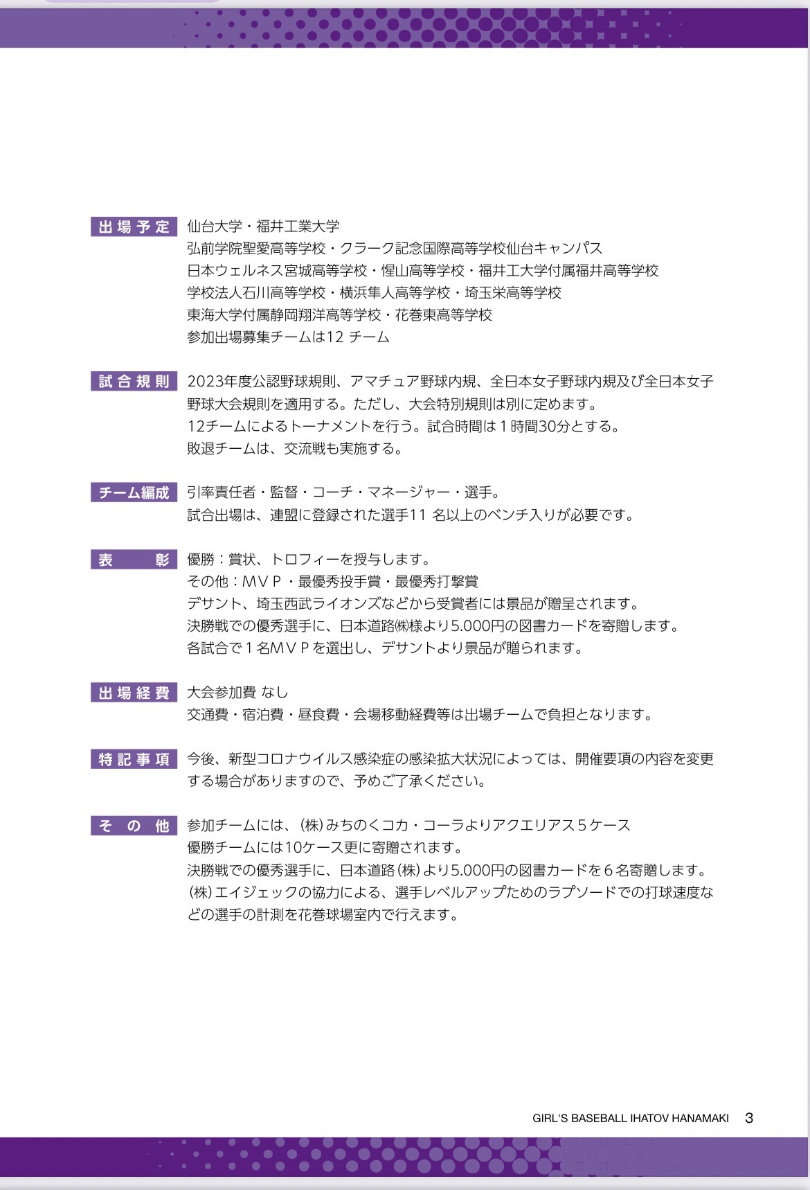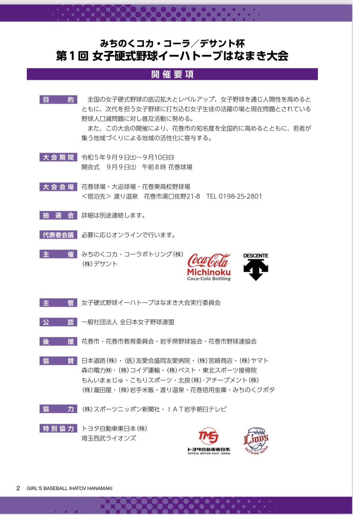 みちのくコカコーラ・デサント杯 第1回女子硬式野球イーハトーブはなまき大会 2023.09.04 9月9日(土)から「みちのくコカコーラ・デサント杯 第1回女子硬式野球イーハトーブはなまき大会」が開催されます。 女子硬式野球のさらなる振興・普及活動を目的にみちのくコカ・コーラボトリング(株)と(株)デサントが主催で開催されます。後援には花巻市も加わり、多くの共産企業の協賛をいただいております。 開催要項1 開催要項2 組み合わせ