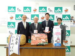 JA全農いわて本部長高橋司様より目録・いわて純情豚・牛乳が、JAいわて花巻代表理事組合長の伊藤清孝様より目録・米俵が小田島順造校長に渡された。