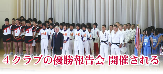 学校全体が高校野球に燃えた熱い暑い8月から,月が改まった9月1日(火),第1アリーナにおいて「優勝報告会」が開催された。 野球応援も大事だったが,それぞれのクラブ活動に闘志を燃やす各部の選手たち。応援の合間を見て,自分たちの練習や試合にも汗を流した。 夏季休業中に各種の大会に出場し,優勝した部が4クラブあった。バスケってボール部女子・柔道部男子・ソフトボール部・バレーボール部男子である。凛々しくそれぞれの伝統と誇りの象徴であるユニホームに身を包んで,優勝旗やカップ・トロフィー・盾,そして賞状を携え,全校生の待つ会場に堂々の凱旋。 ステージに陣取った各部の代表が「いつ・どこで・どんな大会があって・どういう戦い方をした結果優勝したのか」を克明に報告。そして,優勝旗等を全校生に披露するとともに校長先生に受納し,意気を示して後輩へ新人戦への足がかりとしてエールを贈った。 |