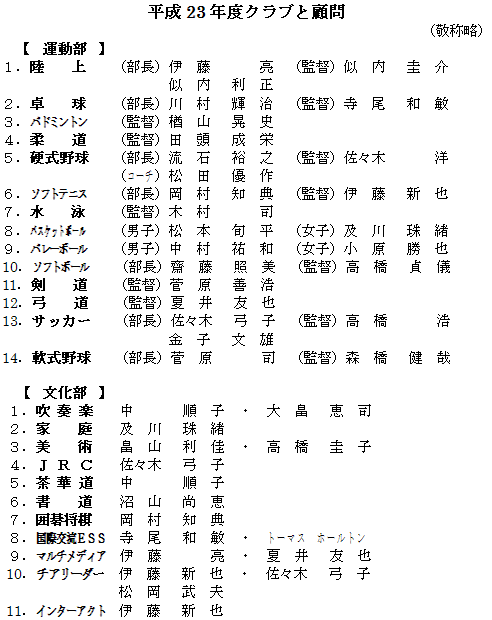 新入生にはこの紹介を参考に,3年間継続し,有意義なものになるような部活動を選んで欲しい。 |